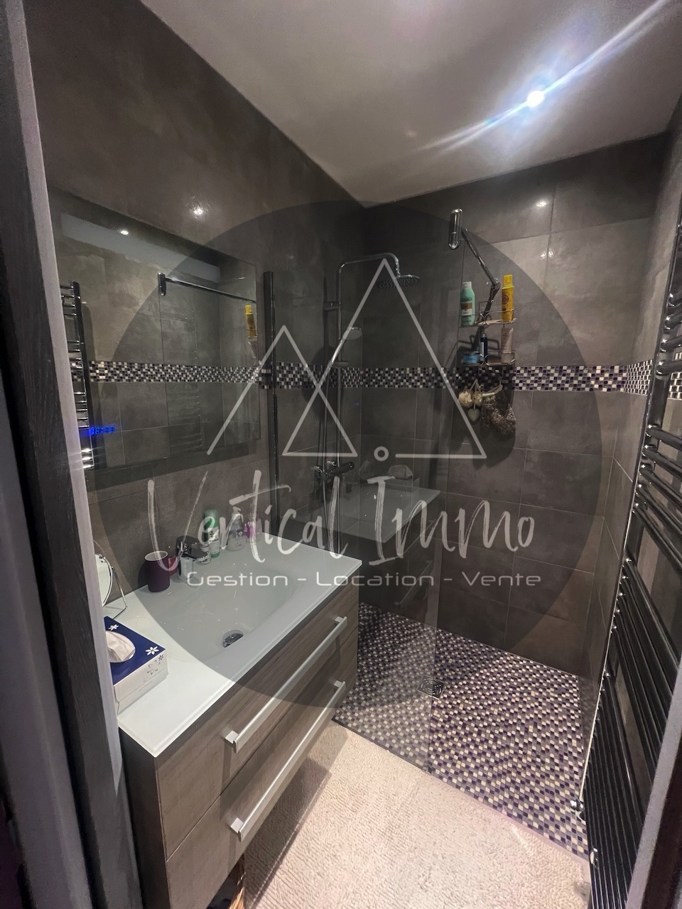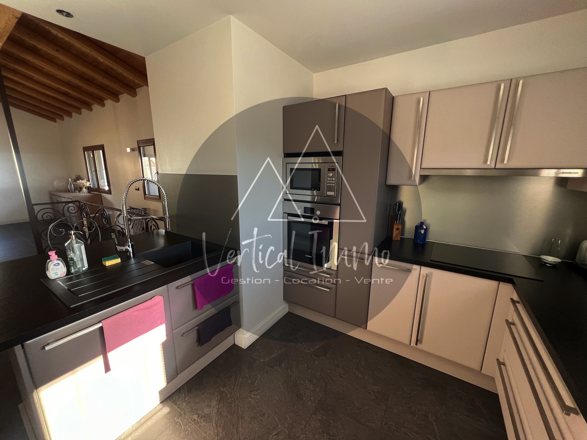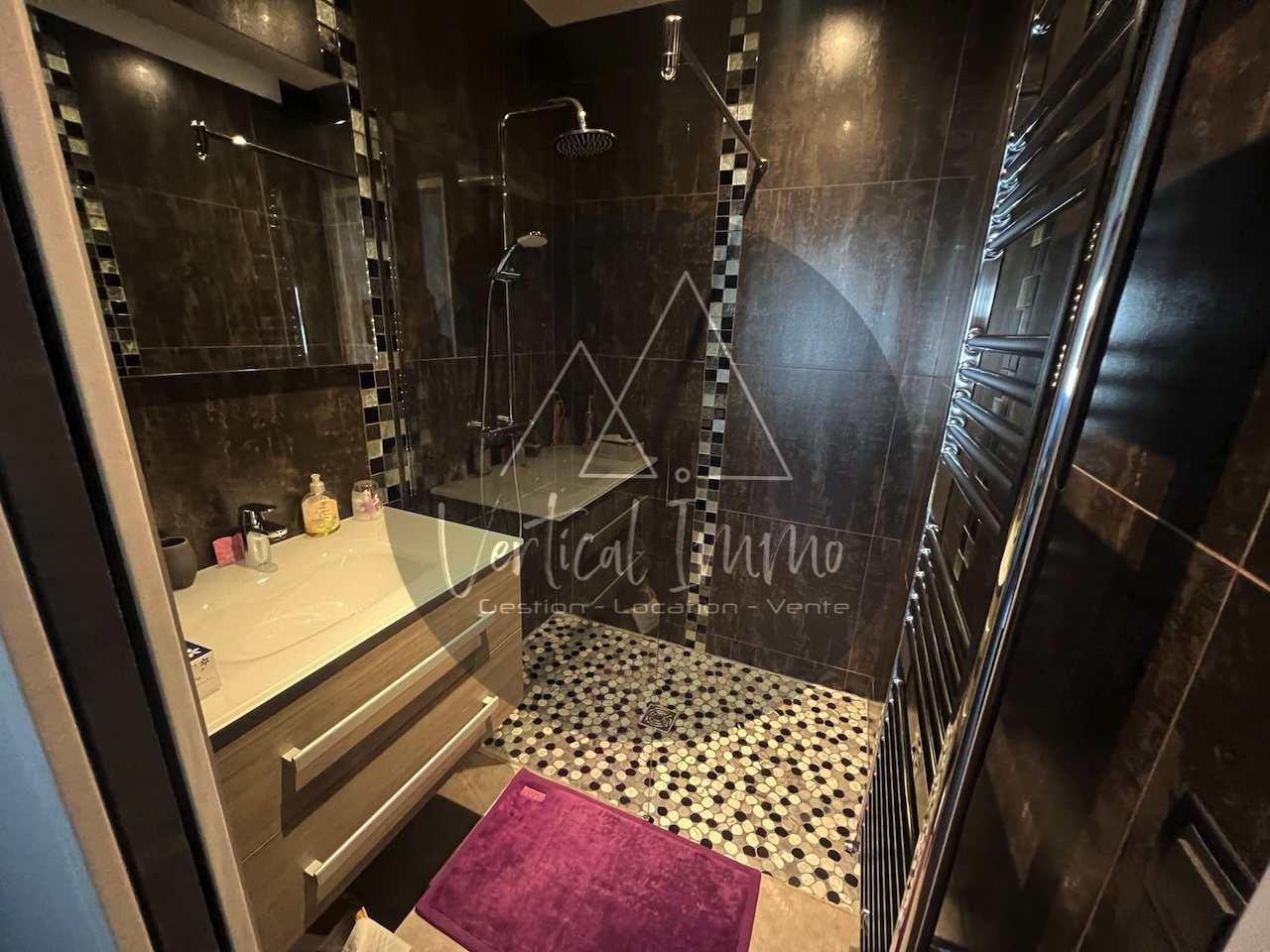 - une pièce aménagée de 17 m2 aménagée avec un double lavabo + cave à vin
